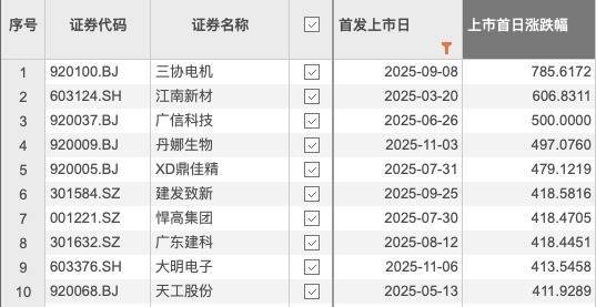 值得一提的是,若以A股上市首日的涨跌幅来看,大鹏工业位居年内首日涨幅榜首。排在其后的包括三协电机、江南新材、广新科技、丹娜生物等公司,这些公司上市首日收盘价涨幅均超5倍,且大部分均为北交所上市公司。