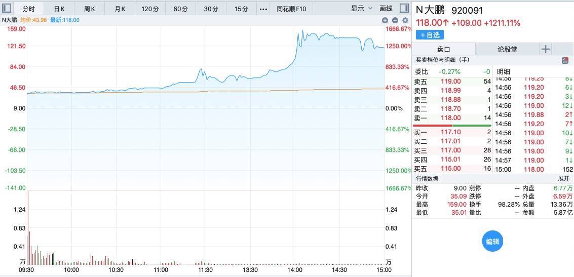 11月21日,北交所新股大鹏工业上市首日股价大涨,盘中一度暴涨1666.67%,触发二次临停。截至收盘,该股股价报118元/股股票配资正规平台排名,涨幅为1211%,总市值为72.53亿元。