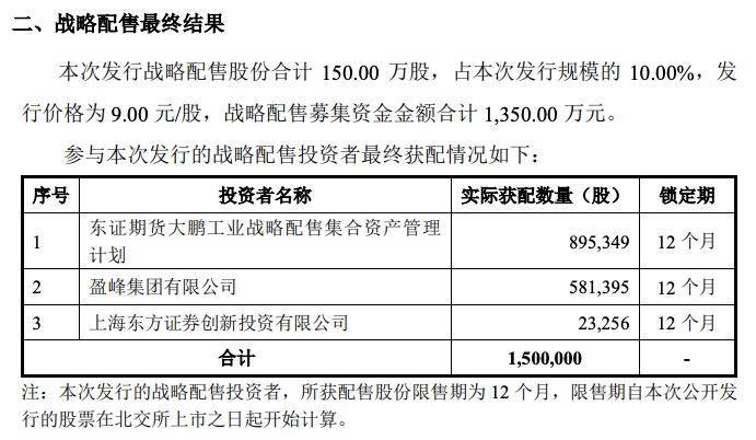 若以今日收盘价计算,东证期货大鹏工业战略配售集合资产管理计划、盈峰集团有限公司、上海东方证券创新投资有限公司分别浮盈9758.77万元、6337.26万元、253.97万元,合计浮盈超1.6亿元。