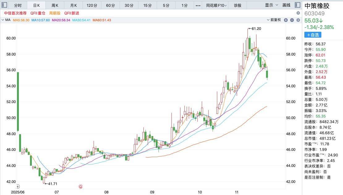 不过也有部分新股上市首日股价仅微涨。例如,中策橡胶首日股价仅涨6.84%。不过,中策橡胶股价在触底后逐渐走高,目前在55元/股左右徘徊。